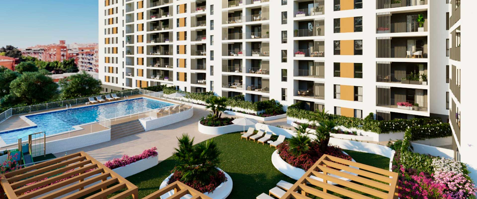 Habitat Infante es un proyecto residencial de 165 viviendas distribuidas en 9 plantas de 1, 2, 3 y 4 dormitorios de obra nueva en Murcia capital, con amplias terrazas, plazas de aparcamiento y trasteros*